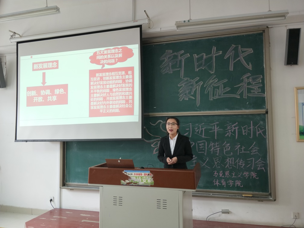 刘丙雯同学以“贯彻新发展理念,建设现代化经济体系”为主题展开了宣讲。她首先阐述了新发展理念的内涵,并对习近平关于新发展理念的重要讲话进行了展开介绍。随后对主题进行展开讨论,分别从深化供给侧结构性改革,加快建设创新型国家,实施乡村振兴发展战略,实施区域协调发展战略,加强完善社会主义市场经济体制和推动形成全面开放的新格局六个方面进行了具体阐述,使同学们对经济方面的了解更加深入。