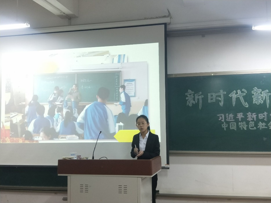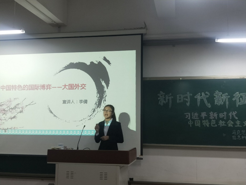 参加此次宣讲活动的一共有四位同学,她们分别从经济、教育、外交和中国梦四个方面为我们解读了十九大精神。首先,在经济方面,刘丙雯同学从深化供给侧改革、加快建设创新型国家、实施乡村振兴战略、实施区域协调发展战略、加快完善社会主义经济体制、推动形成全面开放新格局讲述了经济上的新发展理念。在教育方面,张慧慧同学结合现实教育带我们了解了中国教育发展简史并回顾了教育发展的辉煌五年;然后聚焦当下矛盾,展望未来教育发展的美好蓝图。在外交方面,李倩同学讲述了十九大报告思路、中国外交史、新时代中国特色外交和中国的外交立场,还特别举例讲解了特朗普访华事件。在中国梦方面,高婷同学以“新时代、青年、担当中国梦”三个关键词分析了当代大学生在实现中国梦的过程中应该担当的角色。活动最后,刘丙雯同学介绍了马克思主义学院习近平新时代中国特色社会主义思想传习会,并欢迎同学们踊跃加入。