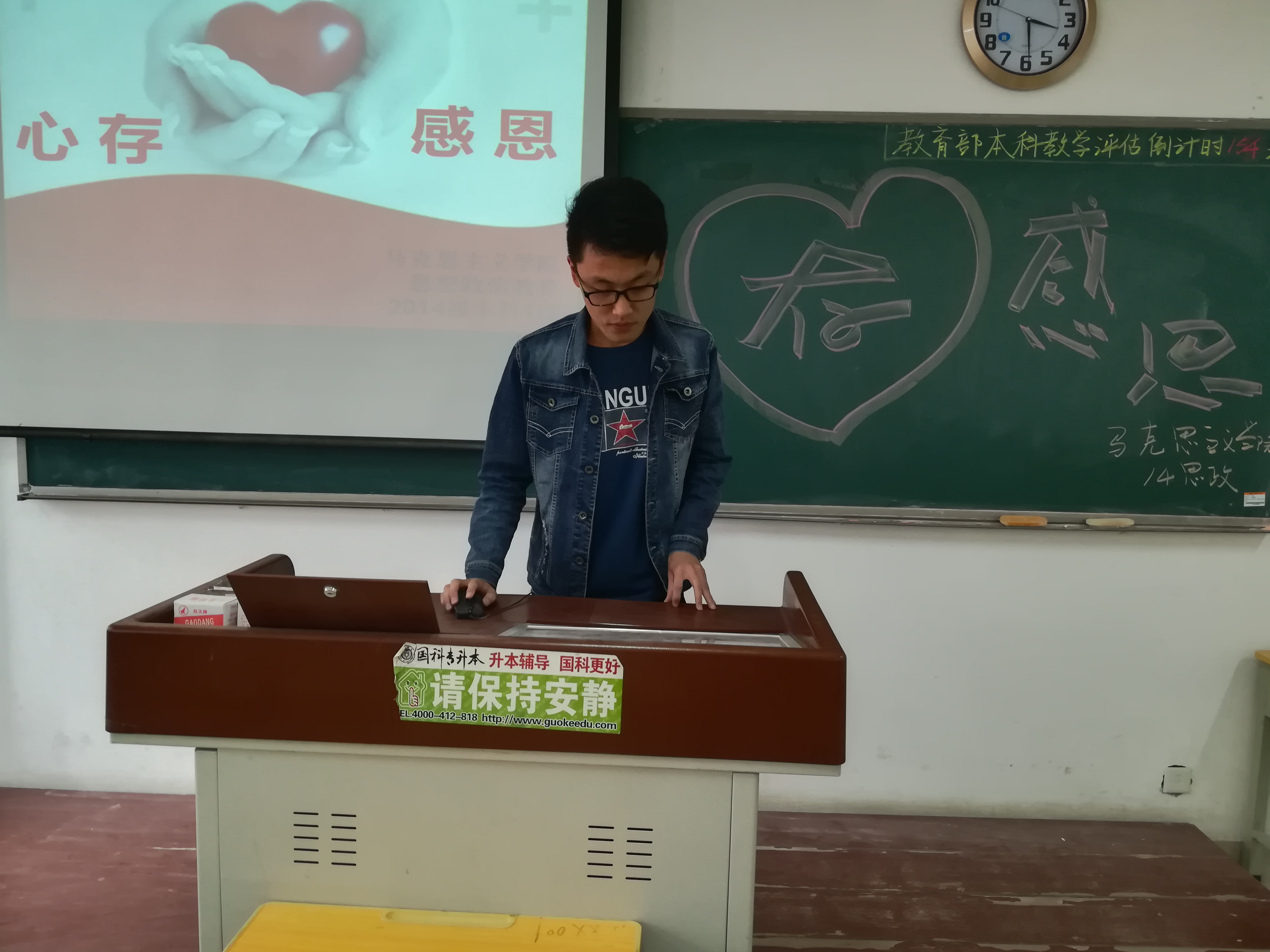 在2017年母亲节到来之际,为了让同学们了解关爱父母,懂得孝敬的具体内涵,了解孝道这一道德修养的重要性,2017年5月8号下午,马克思主义学院2014级思想政治教育本科班全体在校生在2号教学楼A311教室举行了主题为“心存感激”的主题班会,张湘钧和刘美言同学主持了班会。