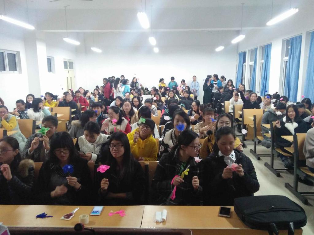 2016年11月20日下午,惠心手工坊在2教A215和A217教室举办了以“丝网花开在师院,文脉湖畔待君来”为主题的手工制作丝网花活动。此次活动以教授社员制作丝网花为主要目的。惠心手工坊社长李琳玉、通讯部部长赵红艳、秘书处部长谭欣、手工部部长郑芳婷和副部长刘平以及全体社员参加了本次活动。