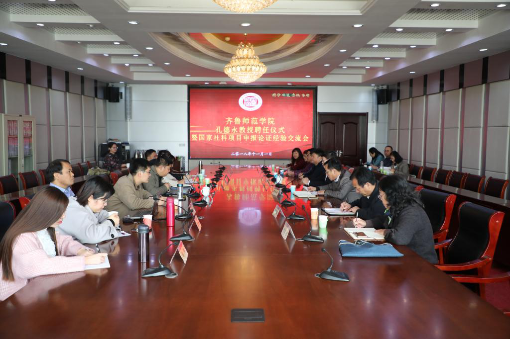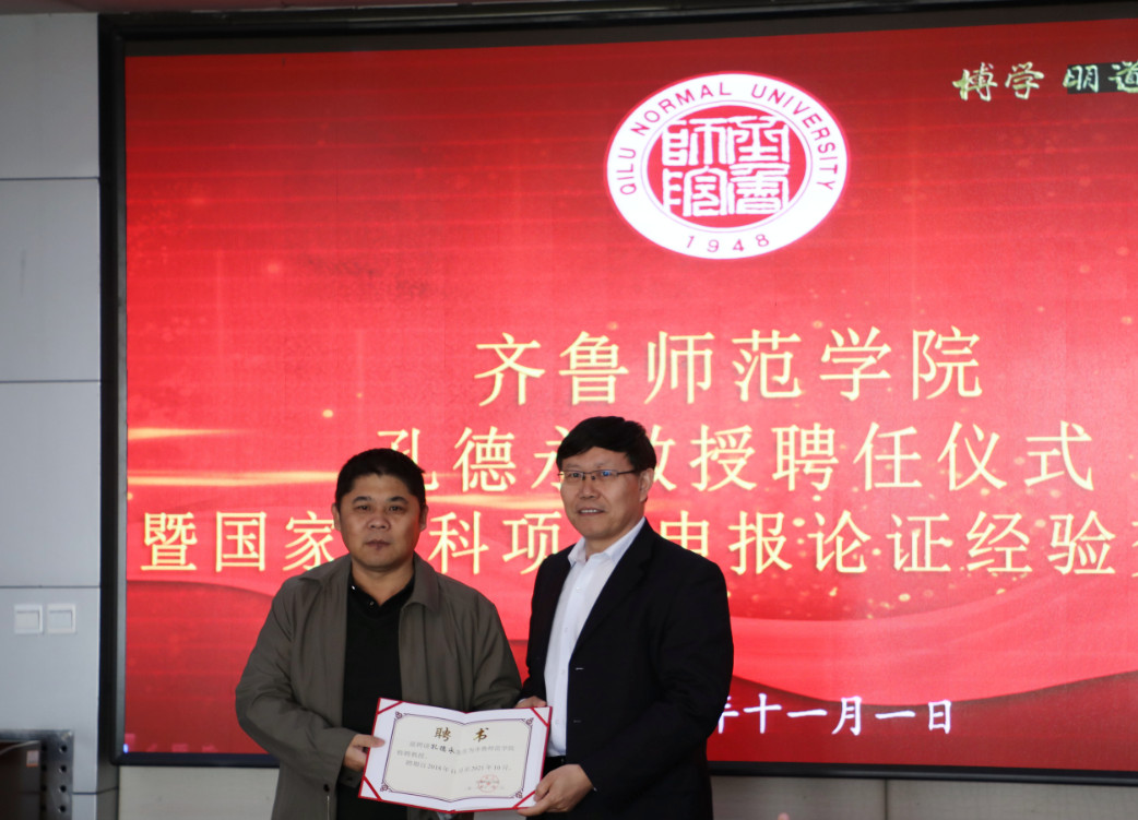 11月1日上午,我校在章丘校区图书馆四楼会议室举行孔德永教授聘任仪式暨国家社科基金项目论证申报经验专题讲座。党委副书记、校长林松柏教授为天津师范大学马克思主义学院博士生导师孔德永教授颁发特聘教授聘任证书。人事处、科研处等部门负责人及马克思主义学院、教师教育学院、外国语学院等文科学院院长、部分教授及教师代表听取讲座。讲座由科研处处长魏培海教授主持。