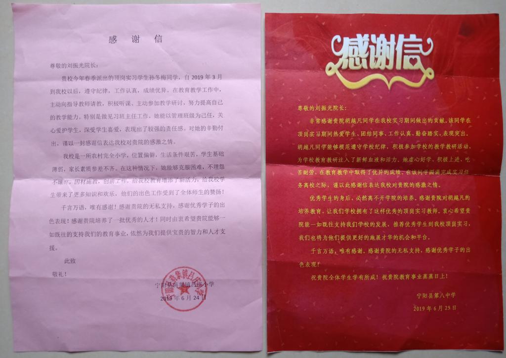 2019年六月下旬,马克思主义学院刘振光院长收到两封来自宁阳县第八中学和吕庄小学寄来的感谢信,在这两封感谢信中,两所学校都恳切地表达了对马克思主义学院培养出优秀学生,并让这些优秀学生在顶岗实习教师的岗位上得以发光发热的感谢之情、钦佩之意。