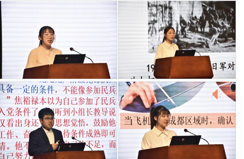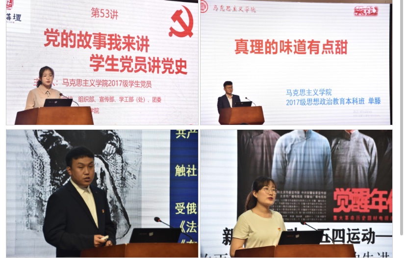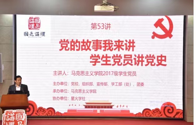随后,马克思主义学院思想政治教育专业单滕、姜士奎、臧叶蕾、毕景玉、唐璐瑶、卢洪瀑、桑玉宁、夏晨晓等8名学生党员依次登上“国是讲坛”,饱含真情、深情和激情讲述了从中国共产党百年历史中撷取的八个经典故事,时间跨度从1921年党的建立到中国特色社会主义进入新时代。他们分别讲述了“中国最早《共产党宣言》翻译者——陈望道:真理的味道有点甜”,“中国第一个马克思主义者——李大钊:敌人可以绞死我,但绞不死伟大的共产主义”,“被敌人乱刀砍死的——陈延年:宁死不跪”,“广州南路地区最早的年仅26岁的女共产党员——钟竹筠:面对敌人的屠刀以死保守党的秘密”,“还原一个真实的抗日英雄群体——狼牙山五壮士”,“党的好干部、县委书记的模范——焦裕禄的三份入党申请书”,“两弹一星元勋——钱学森:我将尽我所能,帮助中国人民建立一个幸福而有尊严的国度”,“中国机长——刘传健:高空中为了128名乘客处惊不乱”。马克思主义学院青年教师党员刘英对8名同学所讲述的党史故事一一予以点评,指出中国共产党百年历史中蕴藏着丰富的营养,包含着无穷的智慧,无数中国共产党人用自己的毕生精力乃至生命书写了百年辉煌的历史,使中国人民站了起来、富了起来并逐渐开始强起来,我们青年一代党员当从党史中汲取智慧和力量,在学思践悟中坚定理想信念,在奋发有为中践行初心使命,赓续共产党人的精神血脉,把红色江山世世代代传承下去。