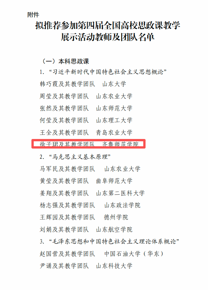 近日,山东省教育厅公布了推荐参加第四届全国高校思想政治理论课教学展示活动的名单。经过资格审核、材料评审、教学展示、培训选拔等多环节严格遴选,我校马克思主义学院教师徐子珺及其教学团队(杭丽华任负责人)凭借扎实的教学功底和创新的教学设计成功获推荐入围《习近平新时代中国特色社会主义思想概论》(本科)组的展示,充分展现了我校思政课教师的专业素养与教学风采。