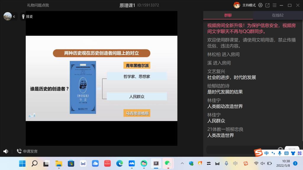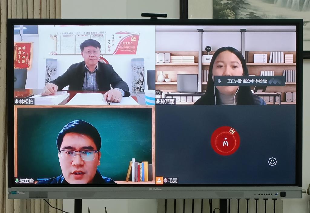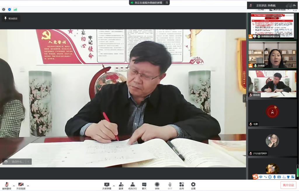 林校长先后线上督导了马克思主义学院近三年新进青年教师孙燕丽、刘畅讲授的两门思政课。孙燕丽老师采用“腾讯会议直播+QQ群资料补充”形式讲授《毛泽东思想和中国特色社会主义理论体系概论》;刘畅老师采用“QQ群课堂直播+超星学习通互动”形式讲授《马克思主义基本原理》。线上听课结束后,林校长与青年教师连线,云端“面对面”进行点评指导。他充分肯定了两位青年教师在疫情期间线上教学阶段的教学质量和课堂实效,肯定了马克思主义学院教师突出OBE教学理念、突出能力范式教学改革、突出问题导向教学方法的一系列教学实践。