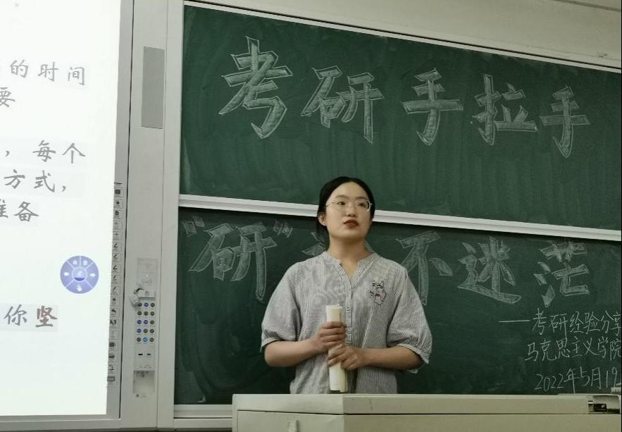 为充分发挥我院优秀学生正向影响和示范引领作用,发扬“传、帮、带”优良传统,引导学生认清考研形势、明确考研方向、汲取考研经验,2022年5月19日,我院组织学生在1号教学楼A207教室通过线上线下相结合的方式,举行了学风引领之“考研手拉手”经验分享交流会。参加本次经验分享交流会的有马克思主义学院教授王晓梅、党委副书记毛雯、以及马克思主义学院2019级全体学生。2018级思想政治教育本科班李鹏礼、林慧莹、张亚楠、邓情文、谭梦雅以及外国语学院张雅菲做经验交流分享。