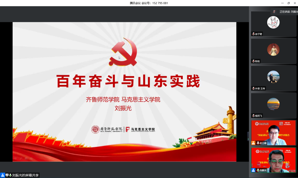 刘振光教授是教育部思政专业认证评估专家、山东省高校思政课教指委咨询委员会委员、山东省高校中国革命史教学研究会副会长、省委宣传部“红色宣讲团”成员。2个多小时的报告中,刘振光教授从中国共产党百年奋斗的光辉历程和历史性贡献、齐鲁优秀传统文化及历史作用与时代价值、山东党组织走过的百年光辉历程、从百年奋斗与山东实践中汲取智慧力量等四个方面娓娓道来,深刻阐述了山东人民听党话、跟党走,迎来从站起来、富起来到强起来的生动实践,充分揭示了中国共产党的领导是中国特色社会主义最本质特征、是中国特色社会主义制度的最大优势。刘振光认为,山东过去100年的发展历程,是马克思主义中国化在齐鲁大地落地生根的理论探索史,是党领导山东人民铸就辉煌成就的不懈奋斗史,我们要把迎接党的二十大激发出的满腔热情转化为新时代现代化强省建设的强大动力,用高质量发展成果体现初心使命,以优异成绩为党的二十大献礼。