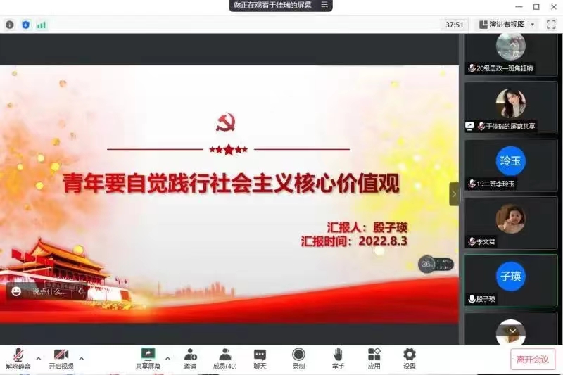 开讲时政述评、创新学习形式。马克思主义学院创新学生政治理论学习形式,搭建了时政述评、新闻播报等新的学习交流平台和形式,先后开展了《论党的青年工作》《新时代伟大成就》《“双碳”政策及分析》《上海合作组织2022年峰会》《筑梦“一带一路”》《博鳌亚洲论坛2022年年会》《第五届数字中国建设峰会》《黑土地保护法》等10多期时政述评,共同观看了《我们这十年》宣传片,回顾十年来中国现代化建设的精彩瞬间,感悟中国十年来的巨大变化,聊体会、谈思想、话期待。
