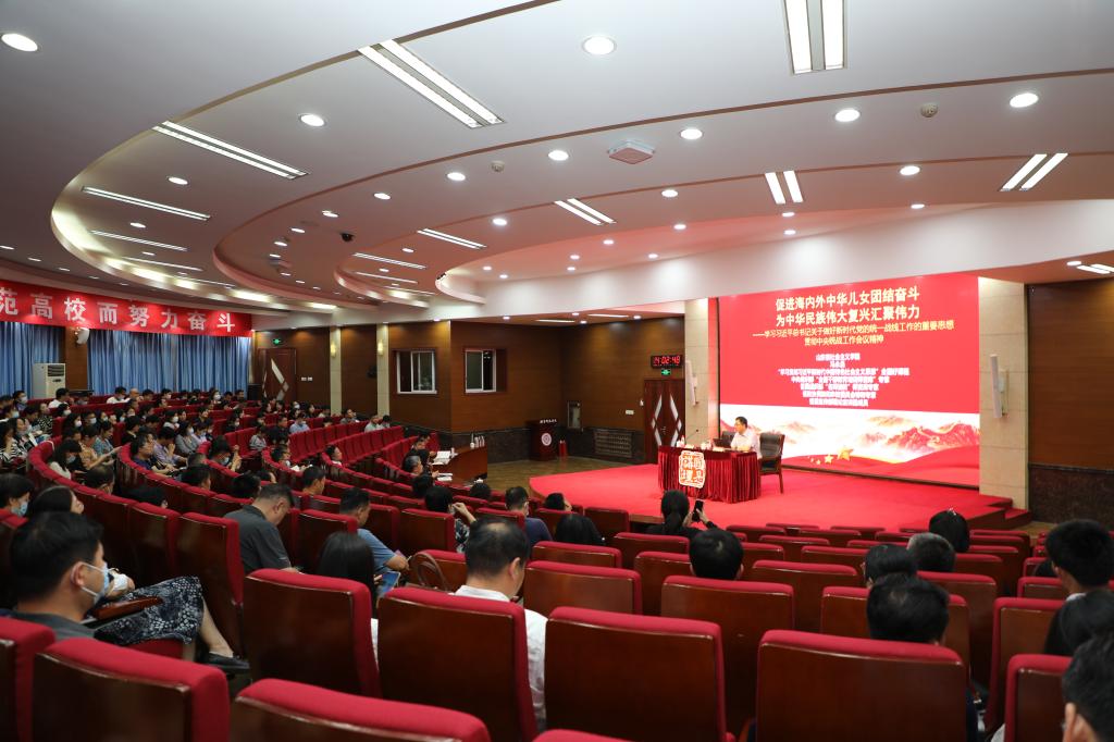 值全国上下喜迎党的二十大,以及我校深入贯彻落实第三次党代会精神之际,为进一步凝心聚力、凝聚共识,9月29日下午,学校党委理论学习中心组(扩大)学习暨“国是讲坛”第五十七期学术讲座在图书馆学术报告厅举办。统战工作研究专家、山东省社会主义学院冯永昌教授应邀作题为《促进海内外中华儿女团结奋斗 为中华民族伟大复兴汇聚伟力——学习习近平总书记关于做好新时代党的统一战线工作的重要思想 贯彻中央和省委统战工作会议精神》的学术报告。学校领导、全体处级干部、全体辅导员、马克思主义学院全体教师、统战委员、统战成员代表到场参加。报告由学校党委副书记赵敏主持。