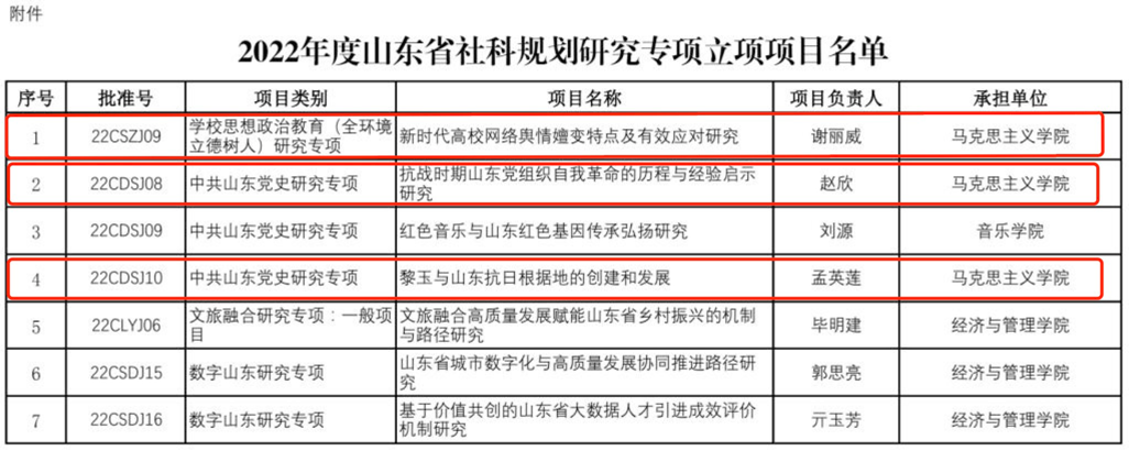 近日,山东省哲学社会科学工作办公室正式公布2022年度山东省社科规划研究专项立项项目名单,我校共有7项课题获准立项,其中我院立项3项,立项总数在全校排名第一。