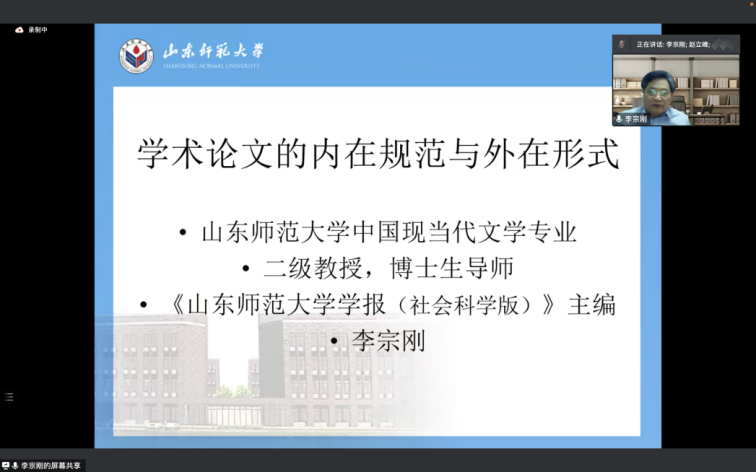 3月23日,马克思主义学院举办“国是讲坛”第60期学术活动。山东师范大学中国现当代文学学科学位点负责人、《山东师范大学学报(社会科学版)》主编李宗刚教授应邀作题为“学术论文写作的内在规范与外在形式”的学术报告。报告由马克思主义学院院长赵立峰教授主持,马克思主义学院全体教师及部分学生近200人在线聆听学习。