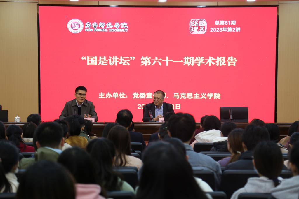 4月6日,“国是讲坛”第61期学术活动在章丘校区2教A111会议室举行,中共山东省委党校校刊编辑部主任、《理论学刊》主编谭建教授受邀作题为“坚定不移全面从严治党,深入推进新时代党的建设新的伟大工程——党的二十大精神解读”的辅导报告。报告由马克思主义学院院长赵立峰主持,马克思主义学院全体教师及部分学生近200人参会学习。