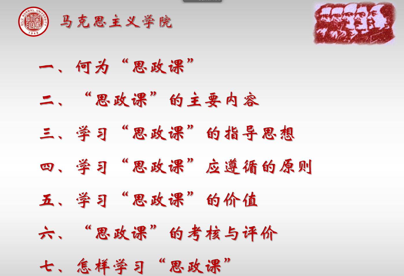 “思政课导学”课程在新生入学后第一学期开设,由“思想道德与法治”教研室作为开学第一课进行讲授。主要围绕何为“思政课”、“思政课”的主要内容、学习“思政课”的指导思想、学习“思政课”应遵循的原则、学习“思政课”的价值、“思政课”的考核与评价、怎样学习“思政课”七个方面展开,通过对思想政治理论课内涵和价值的解读,以及对六门主干课程的主要内容及内在逻辑梳理,从宏观上提升学生对思政课的整体认知水平。