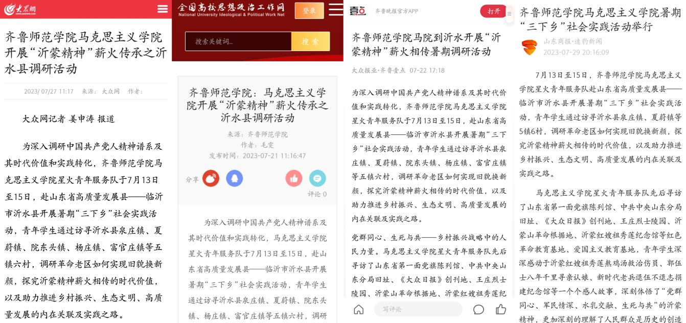 2023年7月13日至15日,齐鲁师范学院马克思主义学院星火青年服务队赴临沂市沂水县开展“追寻红色足迹,传承红色基因”暑期“三下乡”主题调研活动。青年学生通过访寻沂水县泉庄镇、夏蔚镇、院东头镇、杨庄镇、富官庄镇等五镇六村,调研革命老区如何实现旧貌换新颜,探究沂蒙精神薪火相传的时代价值,深挖沂蒙精神与乡村振兴、高质量发展的契合点。本次活动受到多家主流媒体广泛关注。