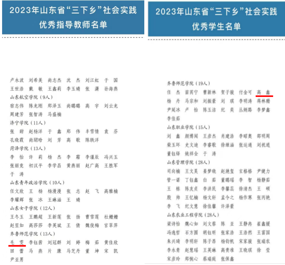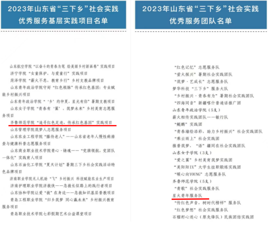 近日,2023年山东省暑期“三下乡”社会实践获奖名单公布,马克思主义学院喜获多项佳绩。马克思主义学院“追寻红色足迹,传承红色基因”实践项目获评优秀服务基层实践项目,星火青年服务队获评优秀服务团队称号,高鑫同学荣获优秀学生荣誉称号,指导教师毛雯获评优秀指导教师。