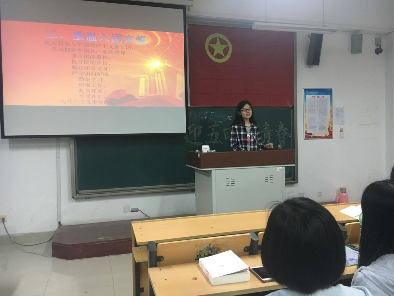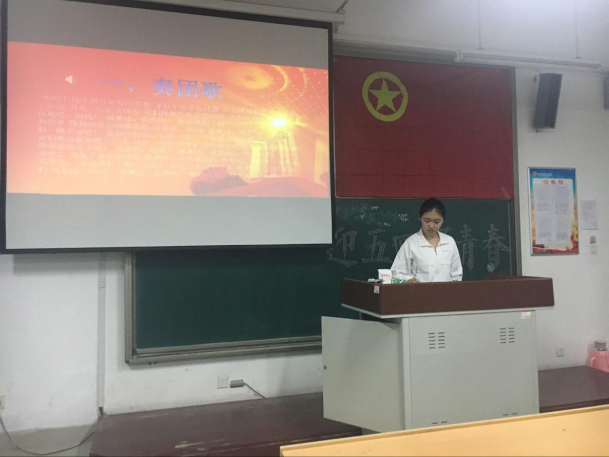 活动开始前,同学们已经大致了解了本次活动的活动背景。活动一开始,团歌奏响,同学们面向团旗庄严宣誓,重温入团誓词;接着,各个班级的优秀团员代表上台,举行佩戴团徽仪式;接下来,2014级陈长红同学和2016级团员代表李昌硕同学上台与大家分享了自己的入团经历以及他们对于“青春”这一话题的理解与感悟,他们以自身经历为例与同学们畅谈青春,共话成长,赢得了同学们的阵阵掌声;最后,全体同学一同观看了教育视频《入团第一课》,本次活动到此圆满结束。