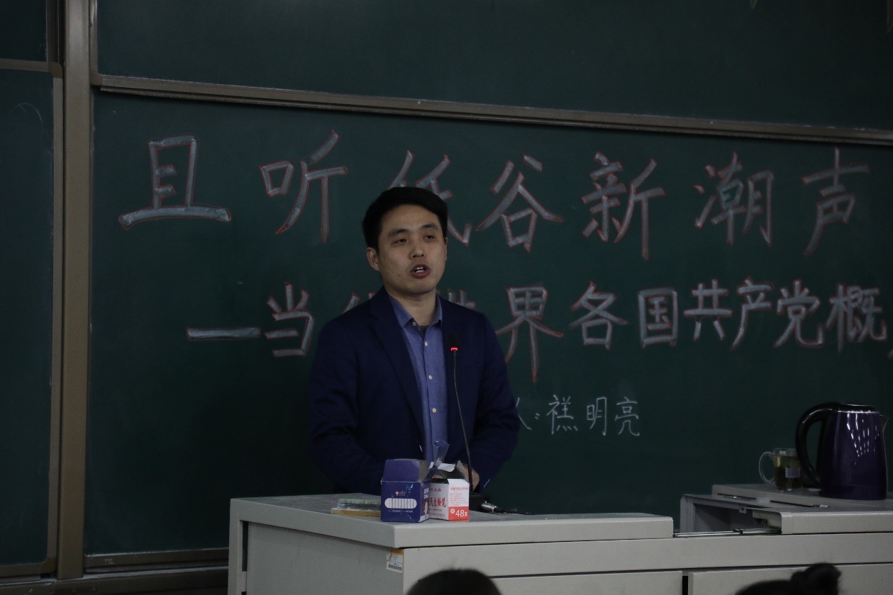 12月12日晚,“国是讲坛”第四十三讲在第一教学楼A405开讲。国内少有的专门研究国外共产党的专家,中国社会科学院世界社会主义研究中心特邀研究员,中国人民公安大学马克思主义学院青年教师、法学博士、三级警督禚明亮带来了一场题为“且听低谷新潮声——当代世界各国共产党概览”的精彩讲座。讲座由马克思主义学院院长刘振光教授辅讲,校团委组织的青年马克思主义者培养工程成员和马克思主义学院全体学生参加。