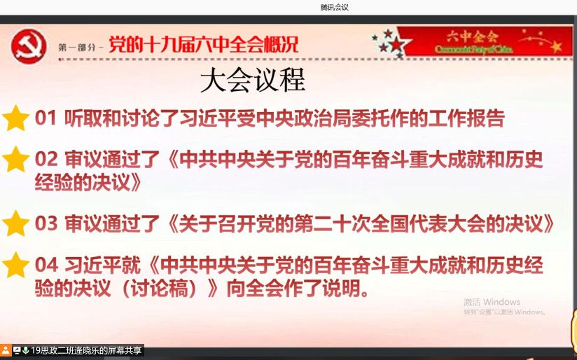 本次会议通过党的十九届六中全会概况、中国共产党百年奋斗的辉煌成就和党的十九届六中全会精神三方面展开学习。会议伊始,王雅文老师带领与会同学们了解本次中央全会的议程,使同学们明晰本次中央全会的深刻内涵。随后,她通过讲述中国共产党百年奋斗的辉煌成就,系统阐述我党百年以来完成的“开天辟地”、“改天换地”、“翻天覆地”、“惊天动地”的雄伟大业。而后,王雅文老师以本次中央全会通过的《中共中央关于党的百年奋斗重大成就和历史经验的决议》为切入点,向与会同学们强调“总结党的百年奋斗重大成就和历史经验”的重要性,并勉励与会同学们担当党员使命、关心国家大事、锤炼扎实本领,在学习实践中检验自己、锻炼自己、提升自己,提交属于新时代党员的崭新答卷。活动最后,与会同学们迅速掀起讨论热潮,交流心得体会。他们表示,作为我院学生党支部的一分子,理应积极学习知识,勇争时代潮头,成为时代的星星之火,为下一个一百年奋斗目标贡献自己的力量。